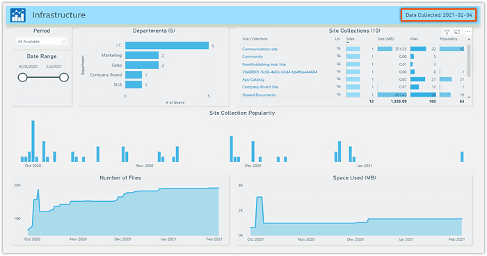 Quick company infrastructure overview for the current date will give general information about the most essential data: Number of site collections, Size of the storage used and its dynamics, popularity trends of your site collections, and other important data.