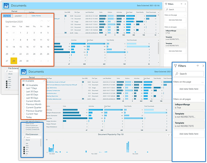 You can see the site popularity trend as well as visitors’ activity (visit path), devices used, Browser name and version, OS, Geodata, visit durations and much more. Drilling down further will reveal the details about files and documents on the site. You will see full information about the document including the version changes, who and when had modified, downloaded and read the document, etc.
