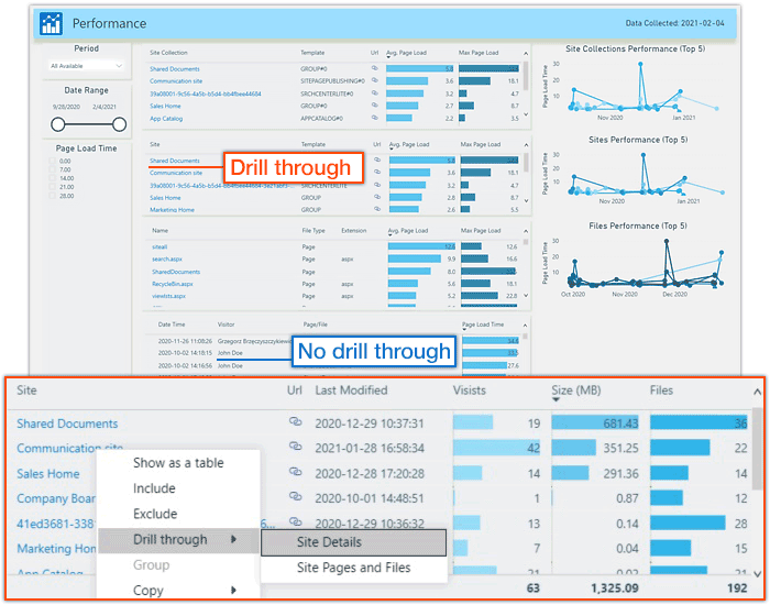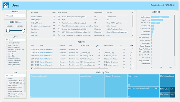 See the full information about SharePoint users in your infrastructure including contact information, Job title, Department and Users' actions. You can see the most visited Websites and the most popular actions that your users perform across your site collection. You can also drill-down to more detailed user information by right-clicking the highlighted fields.