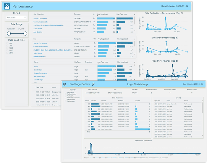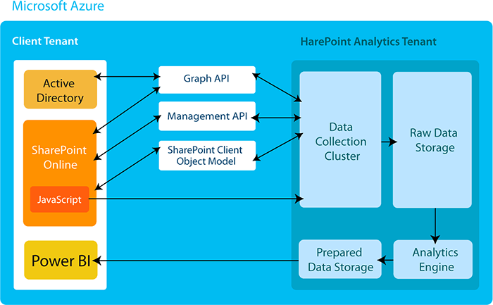 SharePoint Online usage data is collected with the help of Graph and Management APIs, SharePoint Client Object Model, and a special JavaScript tracking code. Later, this information is processed by the HarePoint Analytics engine to be available in detailed Power BI reports and dashboards.